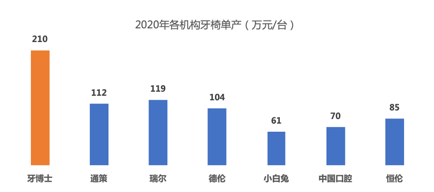 不止牙椅單產(chǎn)高,牙博士的醫(yī)生單產(chǎn)也高。2020年平均每名醫(yī)生貢獻(xiàn)了240萬(wàn)營(yíng)收,高于行業(yè)平均170萬(wàn)的水平。