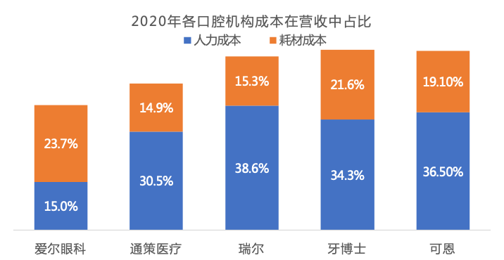 在這種前提下,越是走中高端路線的口腔機(jī)構(gòu),高薪養(yǎng)醫(yī)的情況越普遍。但牙博士的醫(yī)護(hù)成本占比并不突出,總?cè)肆Τ杀局嗅t(yī)護(hù)人員占比營(yíng)收16.5%,甚至接近不這么依賴醫(yī)生的眼科。