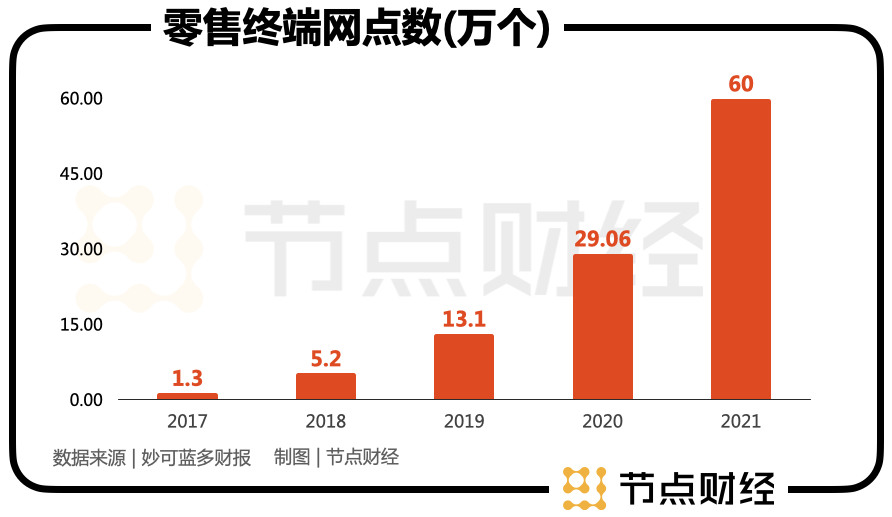 財(cái)報(bào)顯示,2018年-2021年,妙可藍(lán)多銷售終端從5.2萬個(gè)增長至60萬個(gè),年均復(fù)合增速高達(dá)126%,僅2021年就增加近31個(gè),同比增長超過100%。
