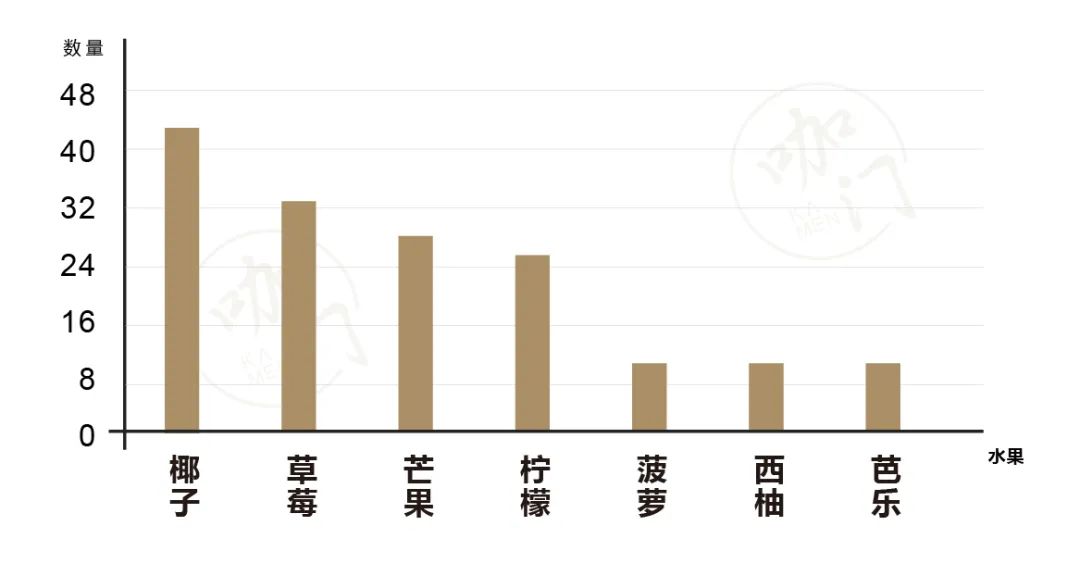 統(tǒng)計(jì)品牌中,椰子出現(xiàn)了42次,成為上新數(shù)量最多的水果,18個(gè)品牌都在上。