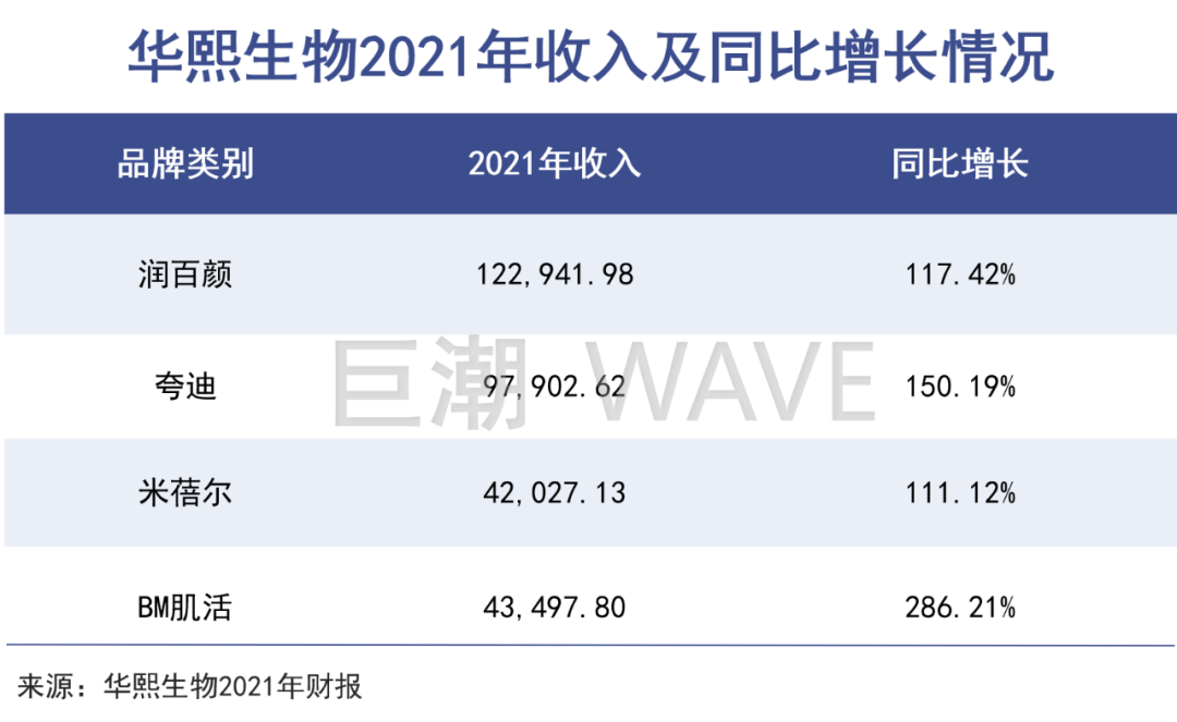 華熙生物董事長趙燕表示:“2021年是華熙生物戰(zhàn)略發(fā)展的關(guān)鍵年”,除了玻尿酸的高增長之外,主要就是四大品牌。其功能性護(hù)膚品收入占總收入近七成,同比增長146.57%,其中潤百顏單品首次實(shí)現(xiàn)單品牌年收入過10億元。