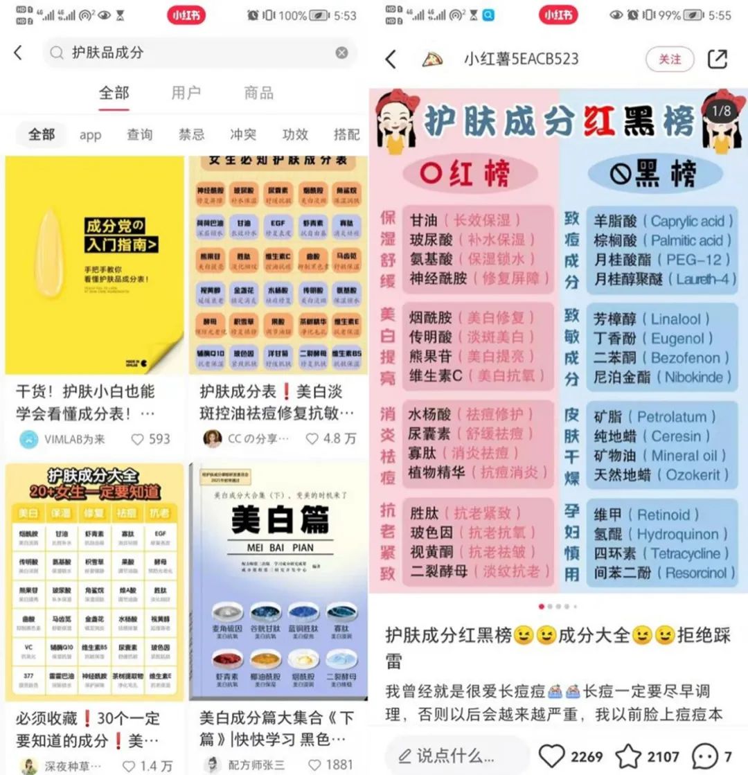 從行業(yè)整體情況來看,近幾年功能性護(hù)膚品快速滲透,消費(fèi)者對于護(hù)膚成分認(rèn)知不斷深入。小紅書平臺上關(guān)于“護(hù)膚品成分”的筆記多達(dá)126萬篇,其中不少博主在筆記里面對護(hù)膚品常見成分的功效、適用膚質(zhì)、產(chǎn)品搭配進(jìn)行詳細(xì)解析,不少消費(fèi)者紛紛加入“成分黨”的行列中。