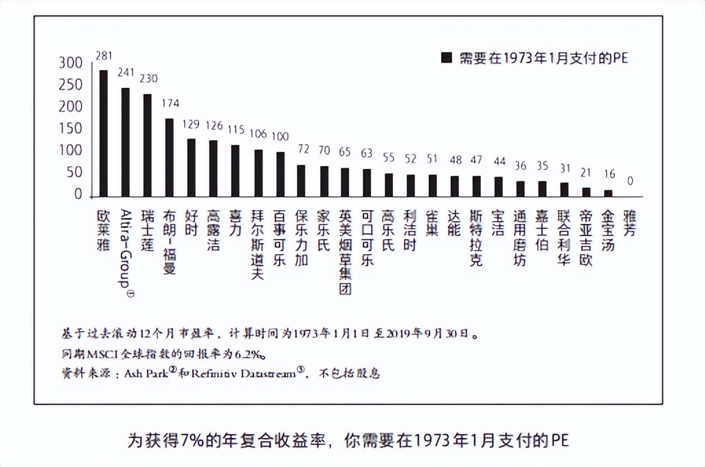 你在1973年為歐萊雅支付281倍的市盈率,或者為高露潔支付126倍的市盈率,為可口可樂支付63倍的市盈率,就可以跑贏指數(shù)。顯然,這種方法并不適合那種變異了的價值投資——簡單地要求估值必須低。然而,即使用某些令人眼花繚亂的估值指標(biāo)來衡量,這些股票也具有良好的價值,這一事實(shí)很難辯駁。
