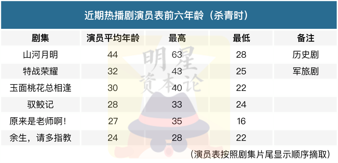 小星星統(tǒng)計(jì)了一下近期熱播劇的演員平均年齡,發(fā)現(xiàn)除了《山河月明》這一積壓了很久的歷史劇外,其他劇集演員的平均年齡都在30歲左右,越是常見的青春甜寵、古裝偶像題材,演員的年齡就越年輕,《原來是老師??!》的男三拍戲時(shí)甚至只有16歲。