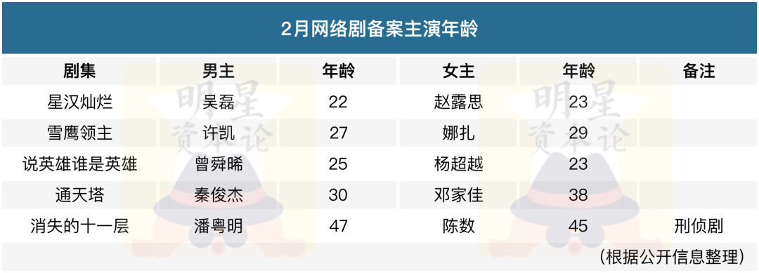 而2月網(wǎng)絡(luò)備案劇里的熱門劇集,除了《消失的十一層》外,其公布的男女主角年齡幾乎都在30歲以下,匹配他們的配角自然需要同年齡的演員。