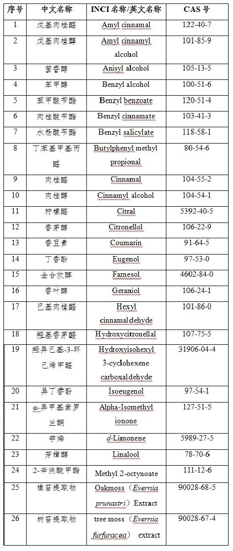 《指導(dǎo)原則》尤其指出,兒童化妝品配方應(yīng)當(dāng)盡可能不用或者少用香精或者香料,公布了不建議使用成分復(fù)雜的可能含有26種致敏性組分的原料作為芳香劑,如戊基肉桂醛,戊基肉桂醇等。并要求對含有26種致敏性組分的香精或者香料,應(yīng)當(dāng)進(jìn)行充分安全評估。
