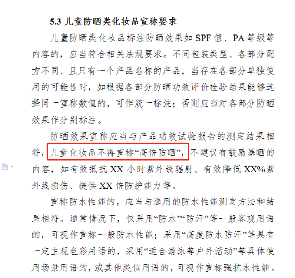 《指導(dǎo)原則》還明確規(guī)定,兒童化妝品不得宣稱“高倍防曬”,不建議有鼓勵暴曬的內(nèi)容,如有效抵抗XX小時紫外線輻射、有效降低XX%紫外線損傷、提供XX倍防護(hù)能力等。