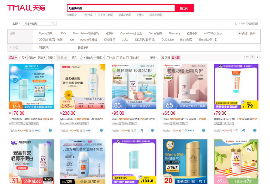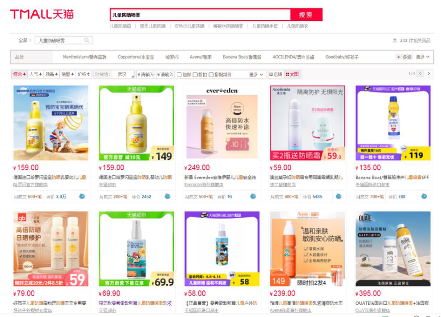 今日,青眼以“兒童防曬霜”為關(guān)鍵詞在天貓上進(jìn)行搜索顯示,共有1360件相關(guān)商品,包含了貝親、水寶寶、紅色小象、宮中秘策、花王等多個品牌,部分產(chǎn)品含有“高倍防曬 輕薄0負(fù)擔(dān)”的宣稱。而以“兒童防曬噴霧”為關(guān)鍵詞在天貓上進(jìn)行搜索時,則顯示有233件產(chǎn)品,但是鮮少有產(chǎn)品中標(biāo)注了“請勿直接噴于面部”“請先噴于手掌、再涂抹于面部”“避免吸入”或類似的警示用語。