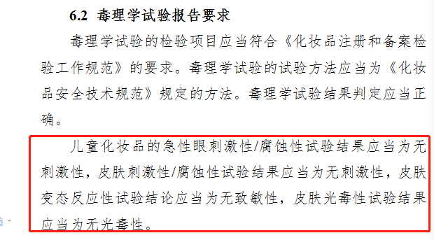 值得一提的是,《指導(dǎo)原則》在“毒理學(xué)試驗報告要求”一項中稱,“兒童化妝品的急性眼刺激性/腐蝕性試驗結(jié)果應(yīng)當(dāng)為無刺激性,皮膚刺激性/腐蝕性試驗結(jié)果應(yīng)當(dāng)為無刺激性,皮膚變態(tài)反應(yīng)性試驗結(jié)論應(yīng)當(dāng)為無致敏性,皮膚光毒性試驗結(jié)果應(yīng)當(dāng)為無光毒性”。
