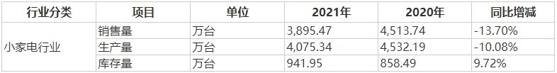 2020年國內(nèi)消費(fèi)需求減弱,但居民受困家中,小家電產(chǎn)品市場呈現(xiàn)“井噴式”增長。至2021年,小家電市場驟然降溫,整體銷售規(guī)模下降。據(jù)奧維云網(wǎng)數(shù)據(jù),2021年廚房小電(12個品類)零售額為514億元,同比下降14.1%;零售量為23744萬臺,同比下降13.5%。