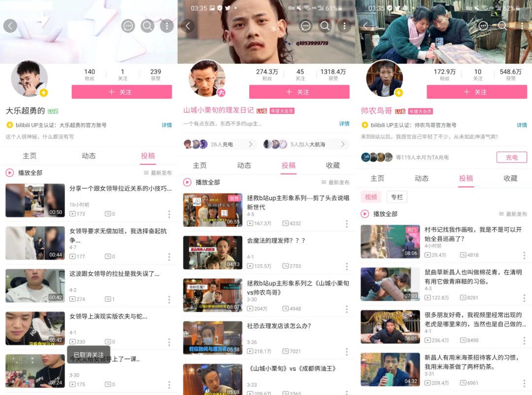 圖:B站豎屏內(nèi)容創(chuàng)作者主頁,從左到右分別為@大樂超勇的 @山城小粟旬 @帥農(nóng)鳥哥