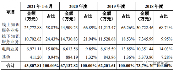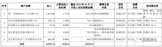 以2021上半年為例,退出公司前五大的客戶包括:中信出版集團(tuán)股份有限公司、北京愛(ài)奇藝科技有限公司。前者2016年公司與其建立合作,目前仍繼續(xù)合作,但報(bào)告期思維造物線下業(yè)務(wù)收入占比較高導(dǎo)致中信“消失”;后者的退出是因?yàn)樗季S造物未繼續(xù)開(kāi)展知識(shí)春晚業(yè)務(wù)。