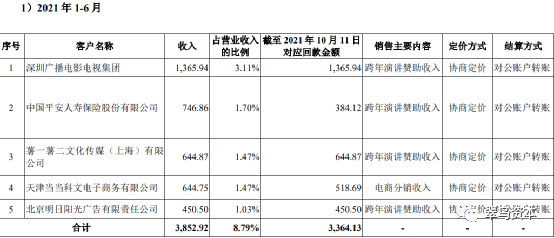 銷售的主要內(nèi)容多以“跨年演講贊助收入”為主,涉及的客戶包括深圳廣播電影電視集團(tuán)、中國(guó)平安人壽保險(xiǎn)股份有限公司、薯一薯二文化傳媒(上海)有限公司等。前五大客戶銷售額占營(yíng)業(yè)收入比例達(dá)到8.79%。2018年-2020年的前五大客戶銷售額占營(yíng)收比例,分別為11.37%、6.14%、9.66%。