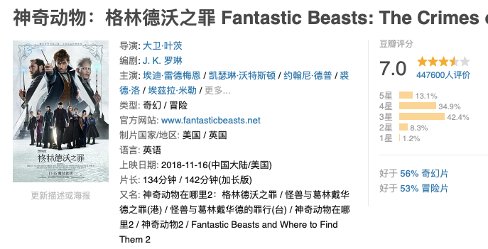 距離《神奇動(dòng)物:格林德沃之罪》上映已經(jīng)過(guò)去近四年。當(dāng)時(shí)輿論對(duì)那部電影的評(píng)價(jià)已經(jīng)是毀譽(yù)參半,雖然豆瓣評(píng)分仍在7分以上,但已經(jīng)有許多影迷指出《格林德沃之罪》的缺陷:故事線雜亂、各種生硬無(wú)聊的家庭倫理戲,魔法特效缺乏想象力……