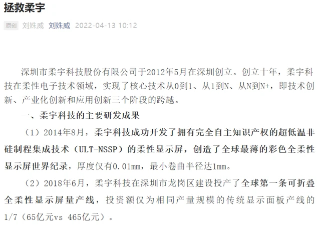 4月13日,中央財(cái)經(jīng)大學(xué)中國(guó)企業(yè)研究中心主任、研究員劉姝威在個(gè)人微信公眾號(hào)發(fā)表文章,建議各級(jí)政府積極幫助深圳市柔宇科技股份有限公司(下稱“柔宇科技”)解決資金短缺問(wèn)題,幫助柔宇科技引進(jìn)戰(zhàn)略投資者,以便開(kāi)拓我國(guó)柔性技術(shù)的應(yīng)用市場(chǎng)。