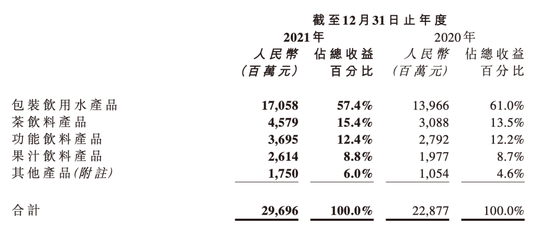 具體來看,包裝飲用水依舊是農(nóng)夫山泉的支柱性產(chǎn)品。2021年全年收益為170.58億元,較2020年增長22.1%,在總收益中占比超半數(shù)達57.4%。但增速低于整體及其他細分業(yè)務(wù),甚至較2020年的61%下降了3.6%。