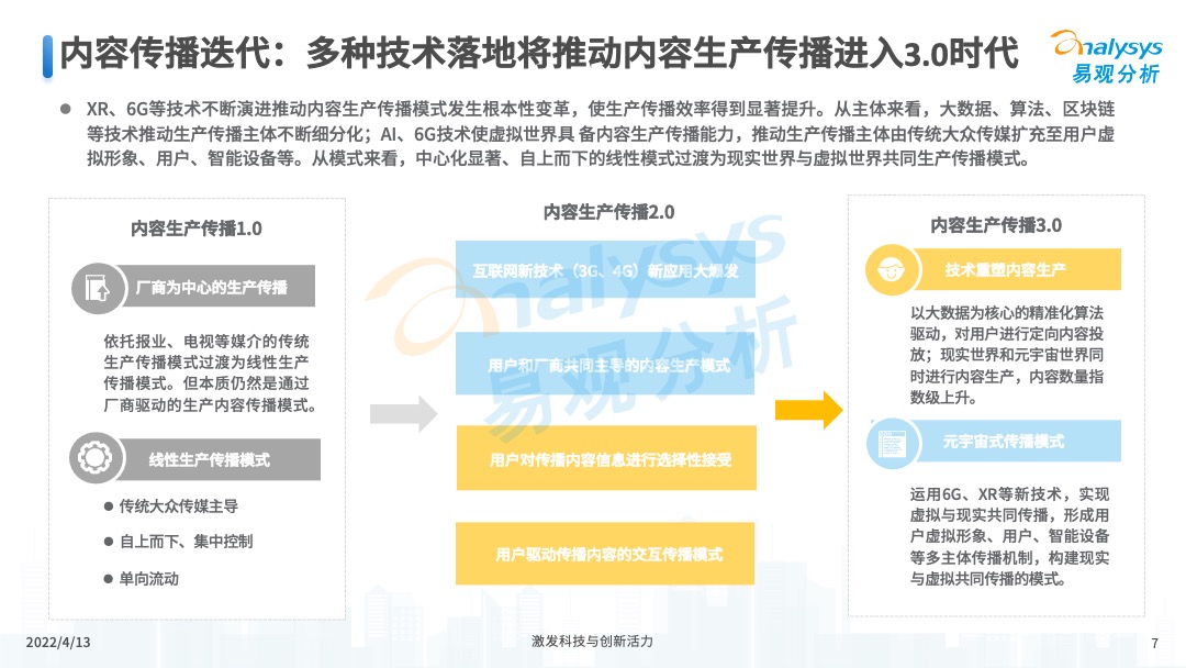 元宇宙背景下,內(nèi)容生產(chǎn)傳播內(nèi)涵不斷發(fā)展拓新,生產(chǎn)傳播質(zhì)量和效率顯著提升,正在邁向內(nèi)容生產(chǎn)傳播3.0時(shí)代。