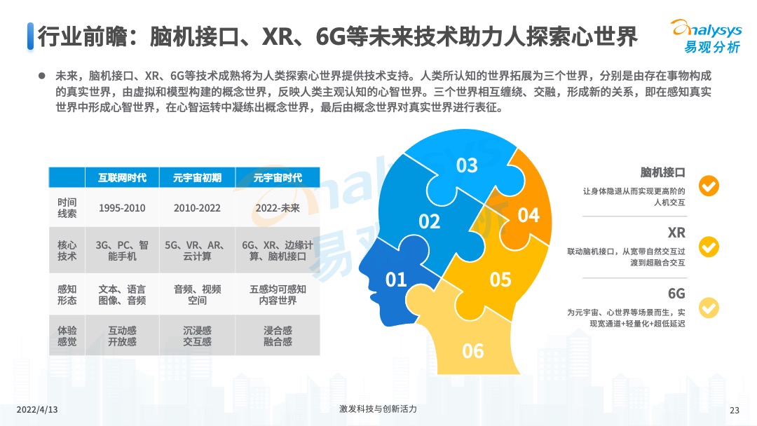 其中,虛擬人、數(shù)字藏品憑借支撐技術(shù)相對(duì)簡(jiǎn)單,發(fā)展時(shí)間長(zhǎng),市場(chǎng)需求凸顯等優(yōu)勢(shì),率先落地內(nèi)容生產(chǎn)傳播元宇宙,釋放出大量商業(yè)價(jià)值。未來,隨著前沿技術(shù)逐步成熟,更多產(chǎn)業(yè)將落地內(nèi)容生產(chǎn)傳播元宇宙。同時(shí),腦機(jī)接口、XR、6G等成熟將為人類探索心世界提供技術(shù)支持。