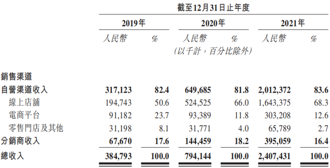 2021年,蕉下線上店鋪及電商平臺銷售額分別占比68.3%及12.6%,零售門店及其他、分銷商收入則分別僅占2.7%、16.4%。