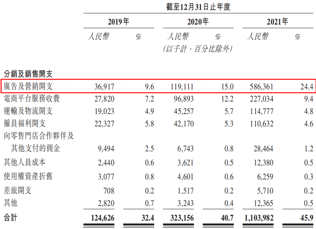 2019年-2021年,蕉下的分銷及銷售開支分別為1.25億元、3.23億元、11.04億元,分別占收入的32.4%、40.7%、45.9%。