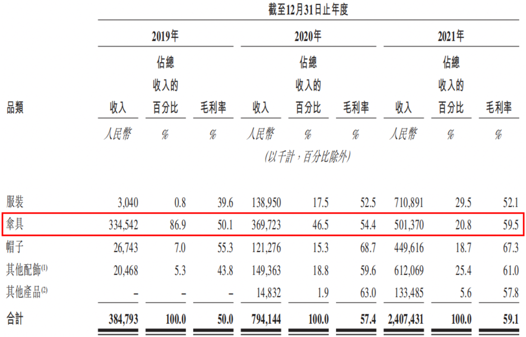 2019年-2021年,蕉下傘具品類的收入分別為3.35億元、3.7億元、5.01億元,占總收入的比例分別為86.9%、46.5%、20.8%。