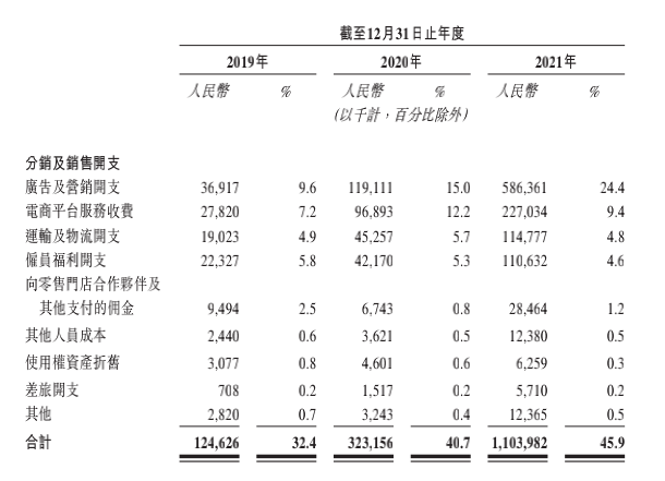 招股書顯示,去年超過11億元的分銷及銷售開支,有超過一半花在了廣告和營銷上。廣告和營銷開支將近5.9億元,是上一年的5倍左右。這一部分支出占收入的比例自2019年開始也逐年增加,分別為9.6%、15.0%和24.4%。
