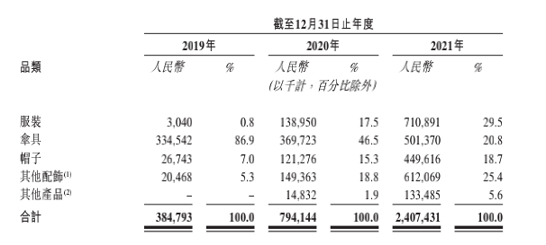 招股書顯示,蕉下“帽子”和“其他配飾”毛利率都超過了60%,其他產(chǎn)品毛利率也都在50%以上。并且,蕉下在不斷的提高“高毛利率產(chǎn)品”的比重,“帽子”和“其他配飾”在2021年的營收比重被分別提升到18.7%和25.4%。