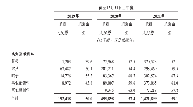 此外,根據(jù)其招股書,過去三年里,蕉下毛利潤分別為1.92億元、4.56億元和14.21億元,毛利率分別為50.0%、57.4%和59.1%。