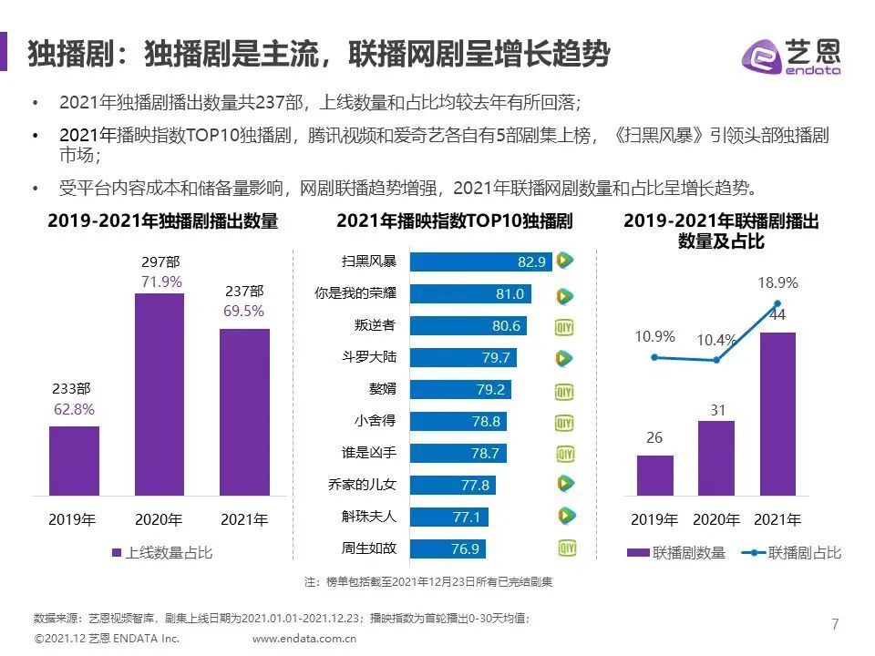 不過很快,關(guān)于聯(lián)播的討論聲量就被超前點(diǎn)播與劇場化運(yùn)營“吸走”,這兩項(xiàng)涉及更多的是獨(dú)播劇集。然而從數(shù)據(jù)看的話,2021年的劇集市場其實(shí)是獨(dú)播出熱劇、聯(lián)播在推進(jìn)兩種趨勢并存的,且聯(lián)播劇的數(shù)量與占比都達(dá)到了三年內(nèi)最高。