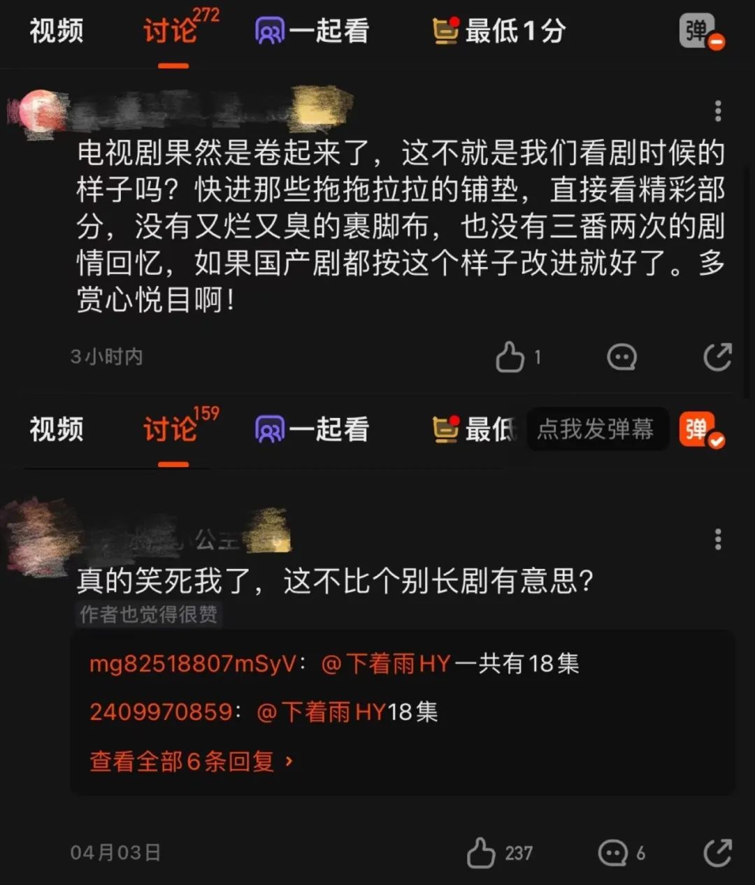 抖快的微短劇,很多是通過短時(shí)長與豎屏來盡量降低用戶在觀看時(shí)的精力腦力投入。中長視頻平臺探索的橫屏短劇則重視劇情的緊湊與反轉(zhuǎn),單集信息量并不小,做得好的話,會是現(xiàn)有長劇的極致脫水版。僅代表硬糖君自己,很期待微短劇、10分鐘左右的中劇今年還會怎么發(fā)育,能否成為催促長劇創(chuàng)新的那只“鯰魚”。