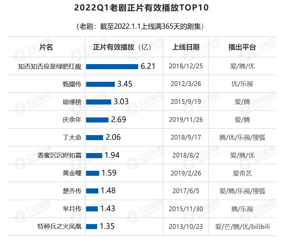 根據(jù)云合數(shù)據(jù)統(tǒng)計(jì),2022年Q1,在全網(wǎng)劇集大盤下滑的趨勢下,老劇有效播放出現(xiàn)逆勢增長,在整個劇集大盤中的有效播放占比達(dá)54%,同比上漲4.3%。老劇有效播放TOP10中,最近的一部是2019年的《慶余年》,最老的一部是2012年的《甄嬛傳》。至于《知否》這部當(dāng)年褒貶不一、硬糖君覺得相當(dāng)爛尾的宅斗劇能有這么大后勁兒,我只能說人民真的太需要宅斗了!