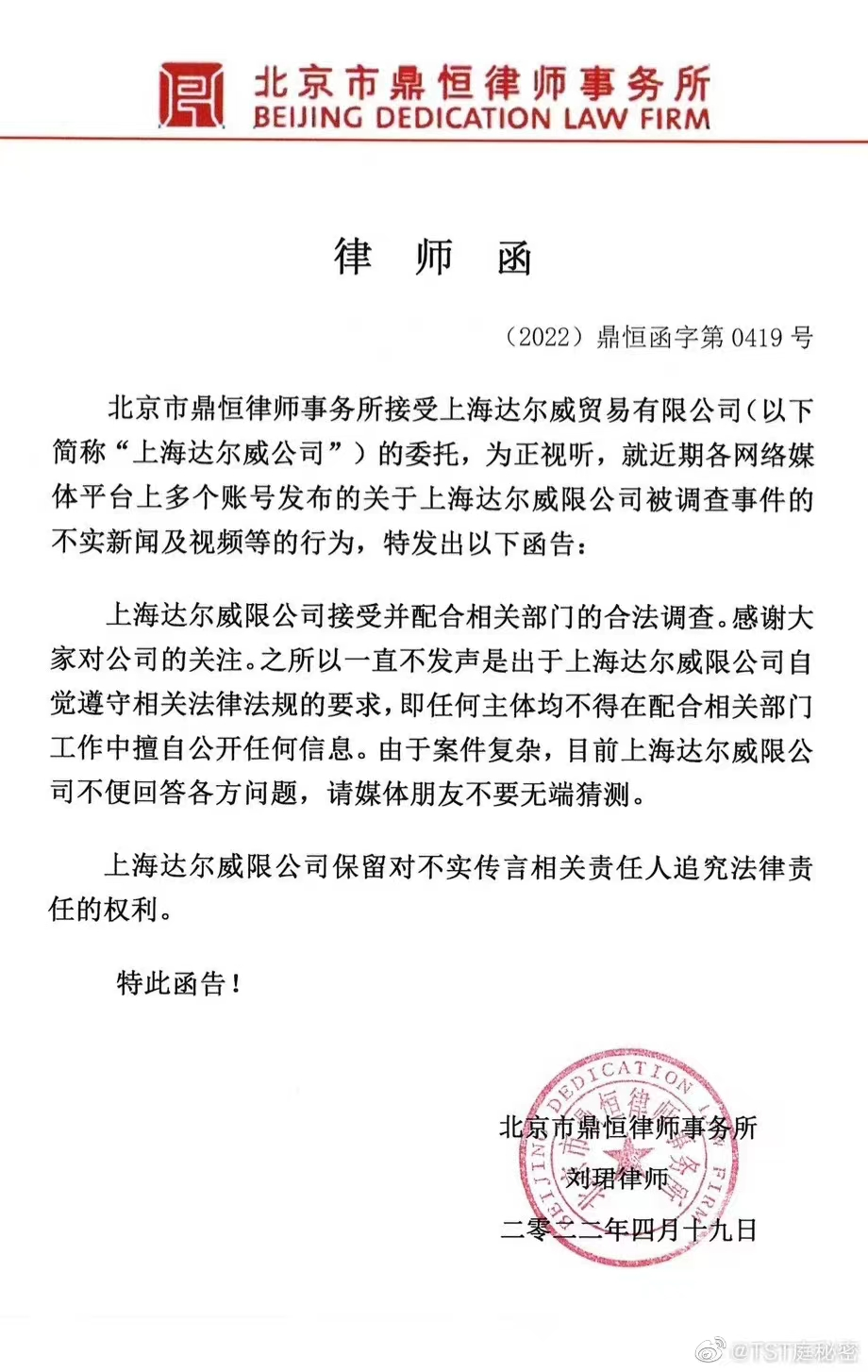 對(duì)此,4月19日,達(dá)爾威公司委托律所發(fā)了一封律師函,針對(duì)近期各網(wǎng)絡(luò)媒體平臺(tái)上多個(gè)賬號(hào)發(fā)布的關(guān)于上海達(dá)爾威限公司被調(diào)查事件的不實(shí)新聞及視頻等的行為做出回應(yīng)。