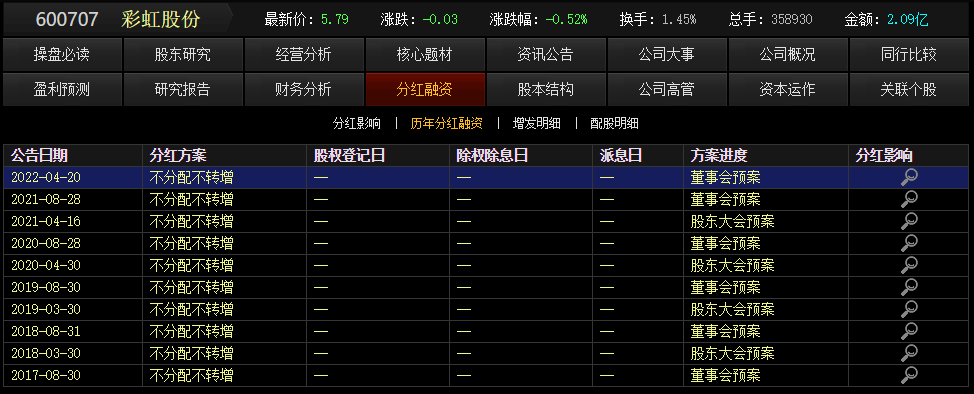 17年來“一毛不拔”,但彩虹股份從市場“吸金”卻不少。