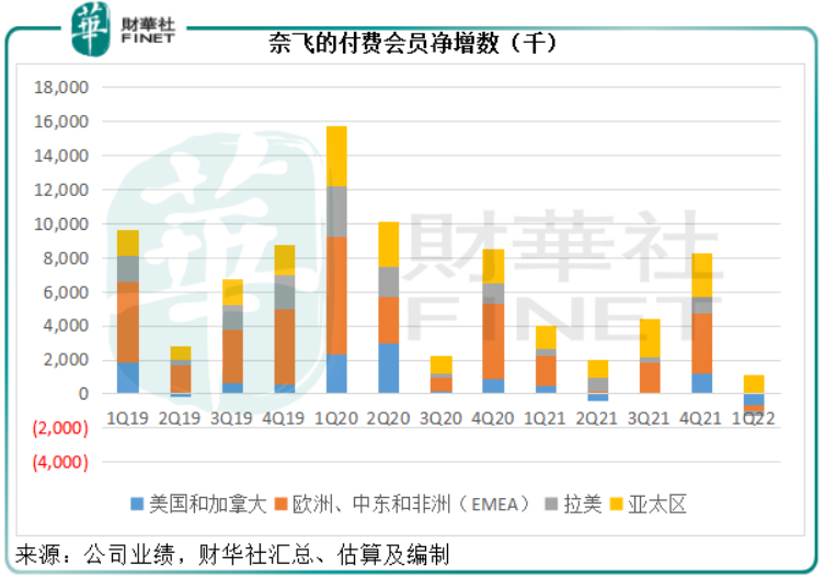 2022年第1季,奈飛的全球流媒體付費會員為2.216億,按年增長6.7%,但較上季減少20萬,主要因為暫停某歐洲大國的服務(wù)及當?shù)馗顿M會員下降,這一變故對付費會員凈增幅的影響為-0.7百萬。