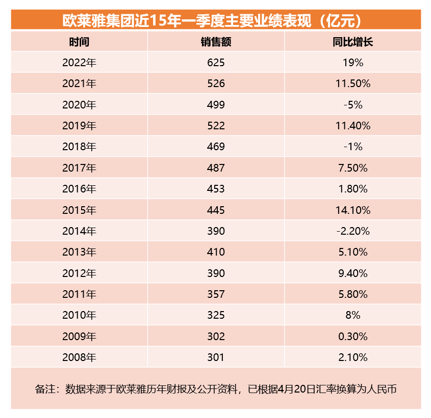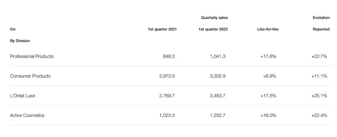 歐萊雅一季度按部門劃分業(yè)績情況(圖來自歐萊雅財(cái)報(bào))