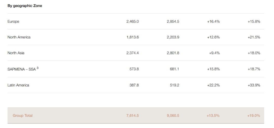 歐萊雅上述5大區(qū)域,一季度銷售額分別約197億元、152億元、193億元、47億元和36億元。其中,拉丁美洲以33.9%的增速,成為增長最強(qiáng)勁的區(qū)域市場。