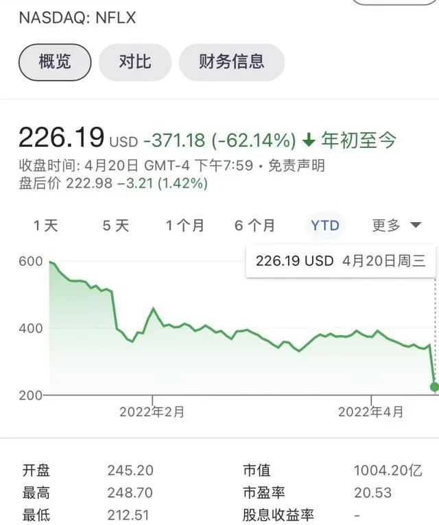 2022年4月19日,奈飛發(fā)布2022年第一季度財報后,股價暴跌35%,市值縮水超過500億美元(折合人民幣3200億)。股價下跌的直接原因是付費(fèi)會員的下跌,財報中提到,奈飛一季度付費(fèi)訂閱用戶凈減少20萬,這是自2011年以來奈飛首次訂閱用戶負(fù)增長。值得關(guān)注的是,在之前的3月,奈飛才剛剛提升了其會員價格:標(biāo)準(zhǔn)會員價格從14.99美元增加到16.49美元,高級會員價格從18.99美元增加到20.99美元。