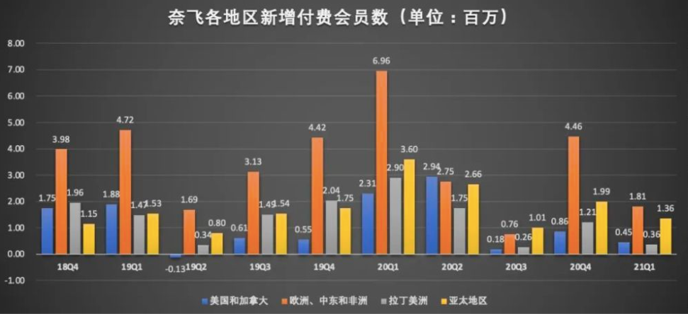 而且在當(dāng)時,增長是全區(qū)域的,美國和加拿大付費(fèi)用戶7000萬,新增230萬;歐洲、中東和非洲付費(fèi)用戶5873萬,新增700萬;拉丁美洲付費(fèi)用戶3430萬,新增290萬;亞太地區(qū)1980萬,新增360萬。