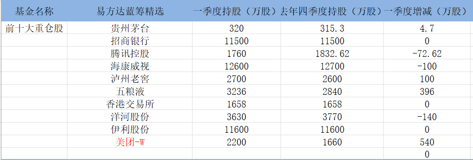 從持倉來看,張坤在一季度依然是高股票倉位操作,重倉股的調倉幅度不大。易方達藍籌精選的前十大重倉股中,除了新增美團-W(03690.HK)取代平安銀行(000001.SZ)外,其余9只重倉股均未變,只是持股數(shù)量有所調整。