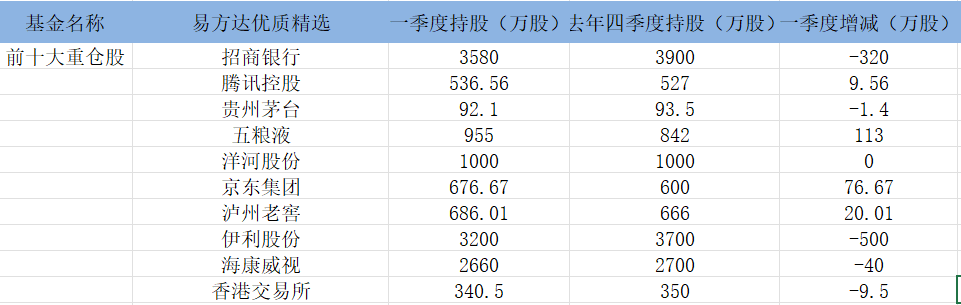 自去年9月調整為為QDII基金,截至一季度末,易方達優(yōu)質精選投資港股通的港股市值為36.6億港元,占凈值比例為21.7%。從前十大重倉股的持倉來看,并沒有新進個股,只是在持股數(shù)量上有所增肌。其中,易方達優(yōu)質精選一季度減持了500萬股伊利股份(600887.SH)、減持了320萬股招商銀行(60036.SH),加倉了113萬股五糧液(000858.SZ)。