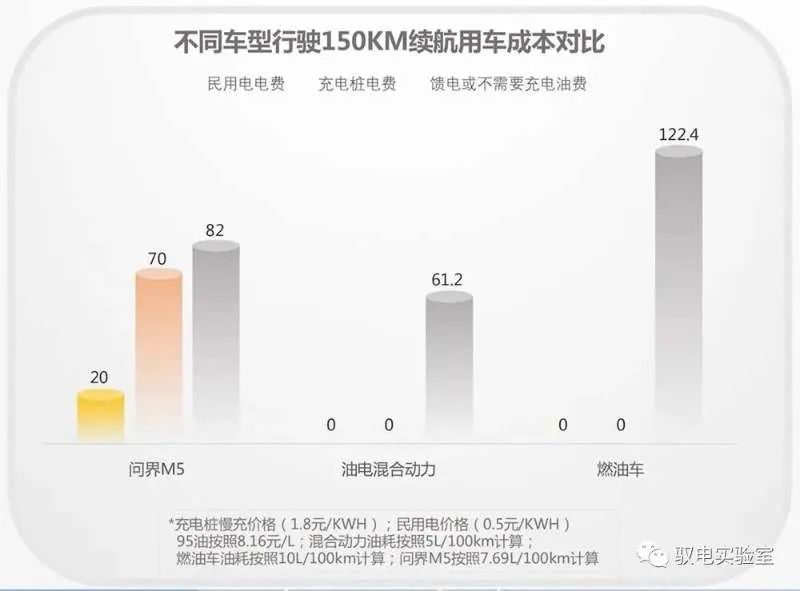 我們來看一下其與油電混和動(dòng)力車和燃油車的150km用車成本對(duì)比。