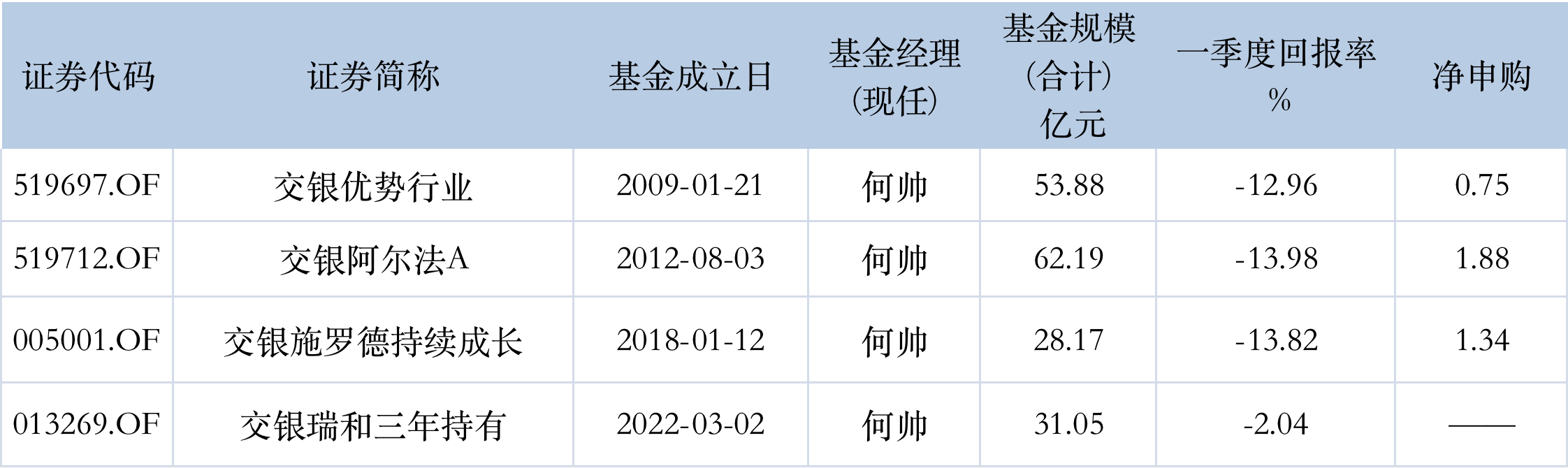 何帥管理的四只基金均以負(fù)收益告收,其中代表作交銀優(yōu)勢(shì)行業(yè)一季度回報(bào)率為-12.96%、交銀優(yōu)勢(shì)阿爾法、交銀持續(xù)成長報(bào)告期回報(bào)率為-13.98%、-13.82%。