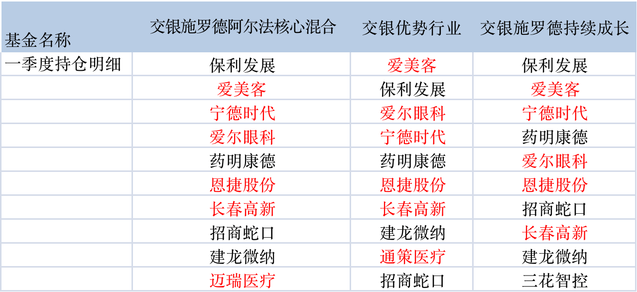 以何帥管理規(guī)模最大的交銀阿爾法為例,一季度股票倉位大幅提升,從去年年底的76.74%升到91.40%,前十大重倉股也迎來大換血,換了一半以上。其中三花智控(002050.SZ)、山東藥玻(600529.SH)、三環(huán)集團(tuán)(300408.SZ)、東材科技(601208.SH)等個(gè)股消失在前十大名單中,取而代之的是愛美客(300896.SZ)、寧德時(shí)代(300750.SZ)、愛爾眼科((300015.SZ)、恩捷股份(002812.SZ)、長春高新(000661.SZ)等。