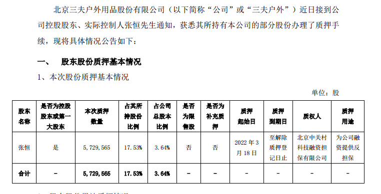 2022年3月22日,三夫戶外還公告稱,近日接到公司控股股東、實(shí)際控制人張恒通知,獲悉其所持有本公司的部分股份辦理了質(zhì)押手續(xù),質(zhì)押股份數(shù)量達(dá)572.96萬(wàn)股,占其所持有股份比例達(dá)17.53%。