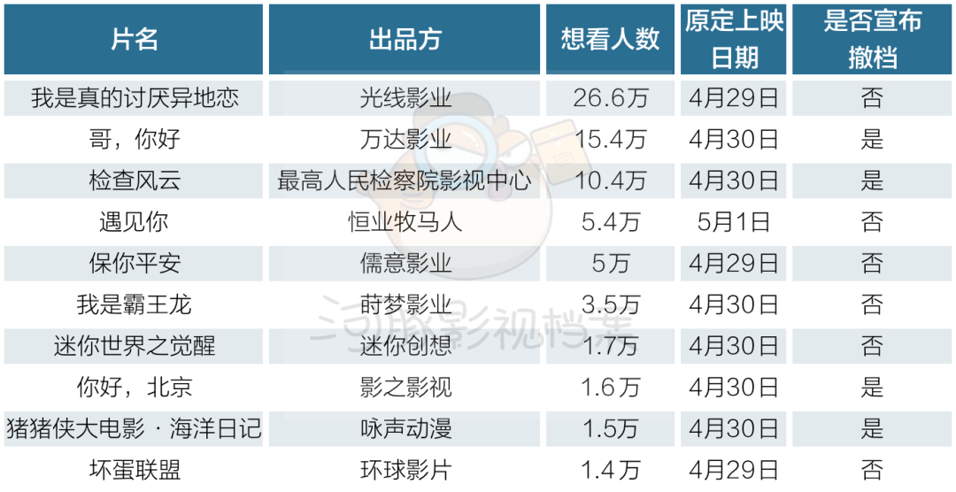 今天,原定于4月30日上映的電影《哥,您好》、《檢查風(fēng)云》、《你好,北京》相繼發(fā)布撤檔通告,理由均為“疫情形勢(shì)”。加上此前已經(jīng)宣布撤檔的《豬豬俠大電影·海洋日記》。原本被視為有望回血大盤(pán)的五一檔,在失守邊緣不斷徘徊。