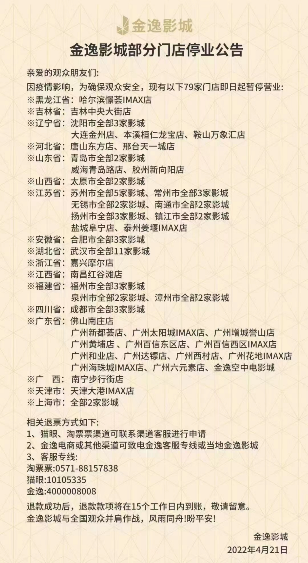 撤檔通告里,四家片方普遍提到了當(dāng)前嚴(yán)峻復(fù)雜的疫情形勢(shì)。3月以來(lái)受疫情影響,多地影院陸續(xù)關(guān)停,營(yíng)業(yè)影院數(shù)量持續(xù)下降。4月21日,金逸影城旗下79家門(mén)店暫停營(yíng)業(yè)。