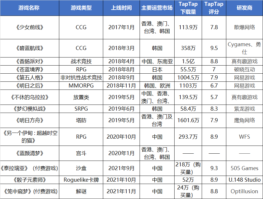 此處我們將重點關(guān)注21年以來TapTap獨家游戲以及非獨家的熱門游戲有哪些?這些游戲有何特征?市場表現(xiàn)如何?