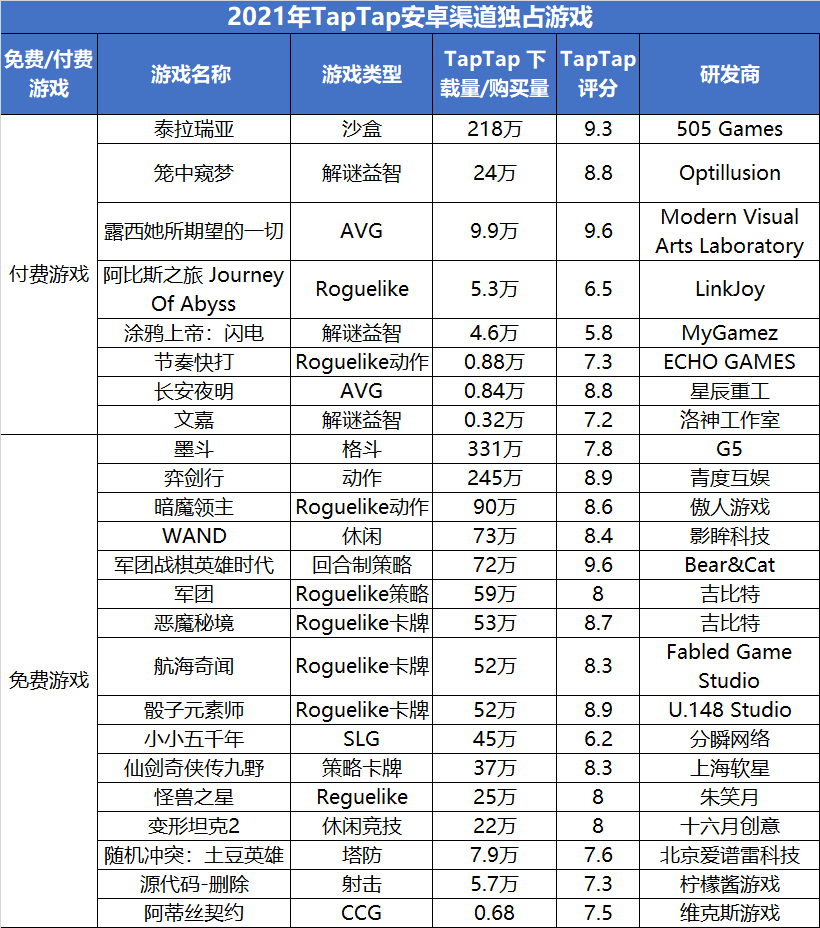 在剛剛過去的2021年,TapTap平臺一共上線了24款獨占游戲,其中付費游戲8款,免費游戲16款。