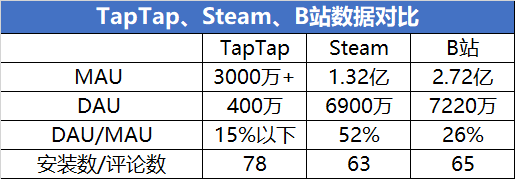 值得關(guān)注的是,目前Steam DAU/MAU 高達52%,也就是說超過一半的月活用戶也是日活用戶。在此方面,TapTap和B站距離Steam還有不小的差距。