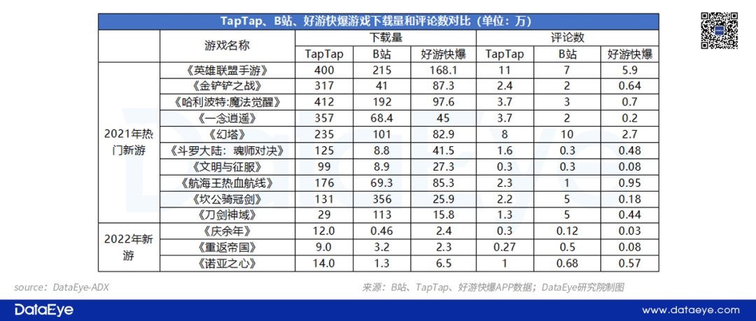 如果對比”下載量/評論數(shù)”,B站13款游戲平均每30次下載就會留下一條評論,TapTap和好游快爆這一指標分別為81和106,這說明B站游戲區(qū)社區(qū)氛圍更好,用戶粘性更強,而TapTap和好游快爆工具屬性較強,用戶“用完即走”。